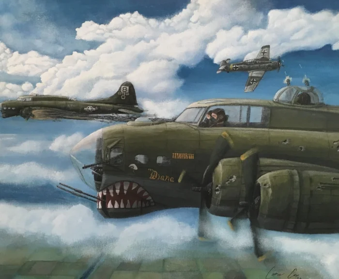 "Hell at 25,000 Feet" is an acrylic painting I made my senior year of high school to commemorate my grandfather's service into 95th Bomb Group during World War Two. This painting was specifically about the raid where they attacked Brunswick on February 10, 1944.