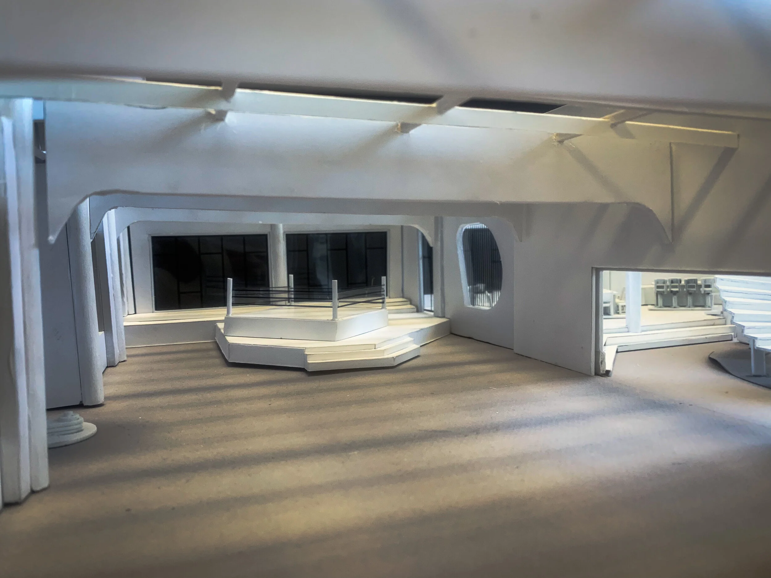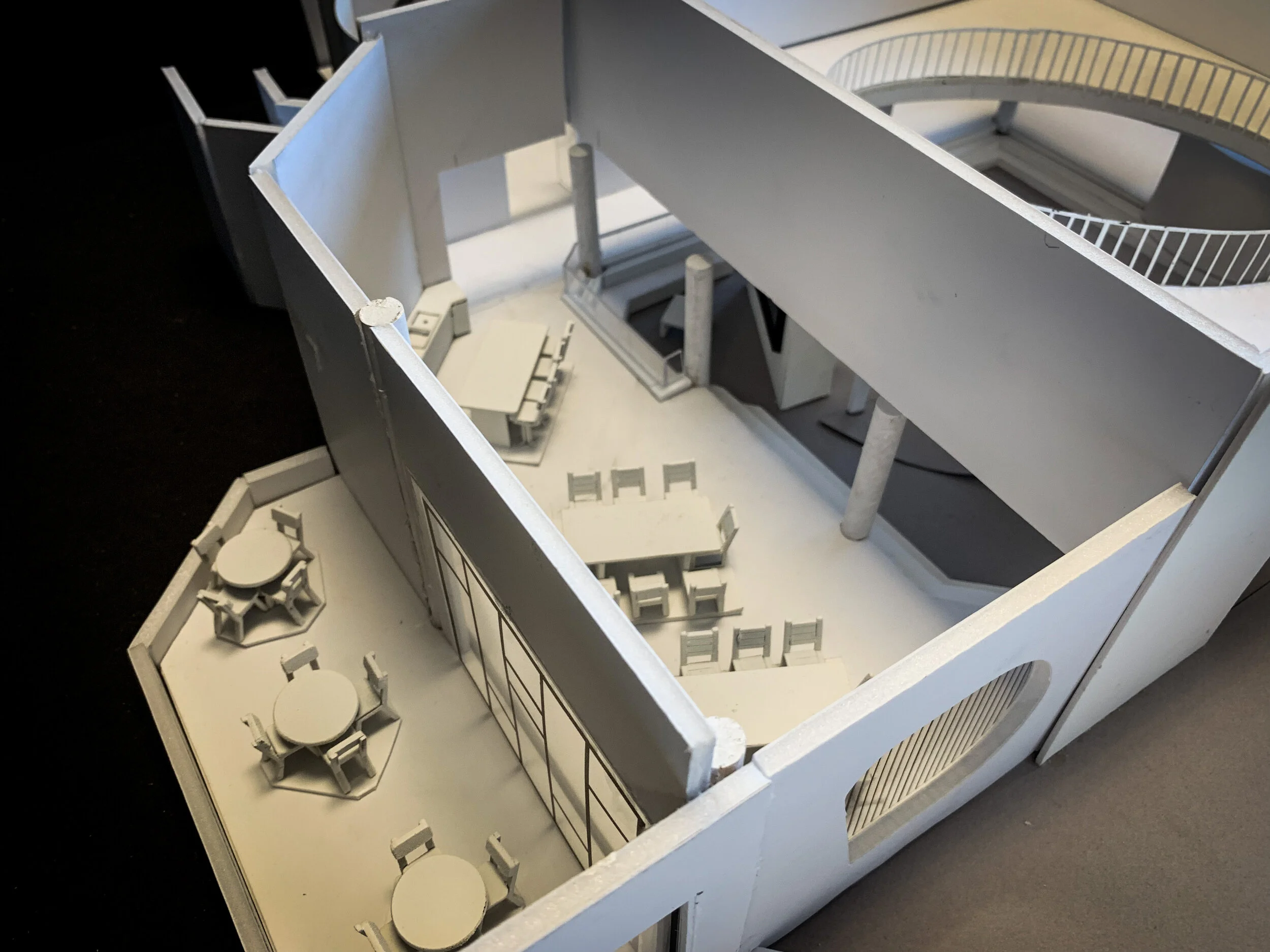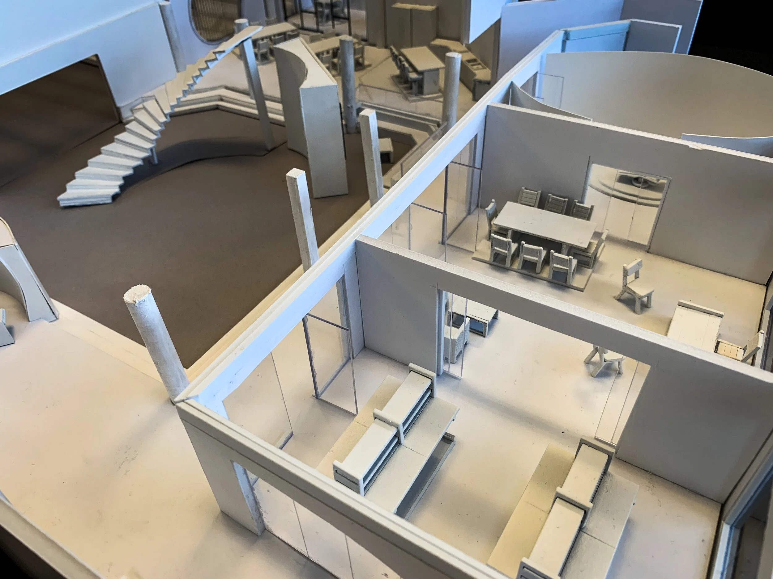 Above is a white, 1/4” scale model of Emily’s Compound in Thunder Force. The model was entirely constructed out of foam core, basswood, and bristol board.