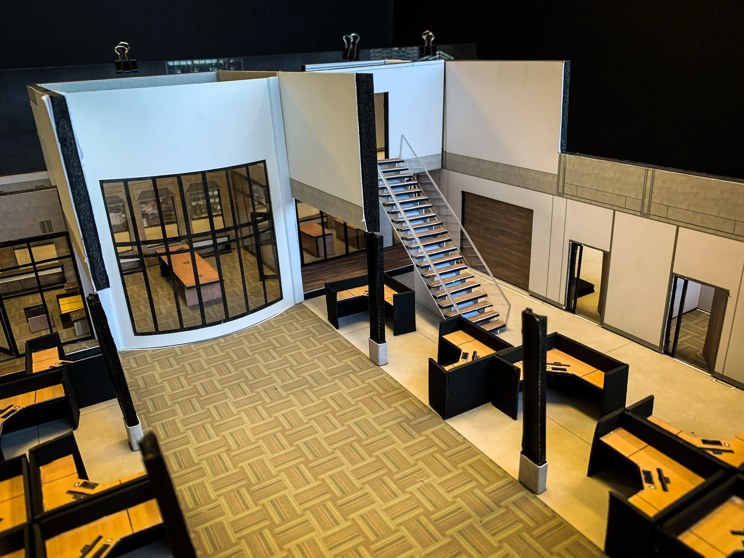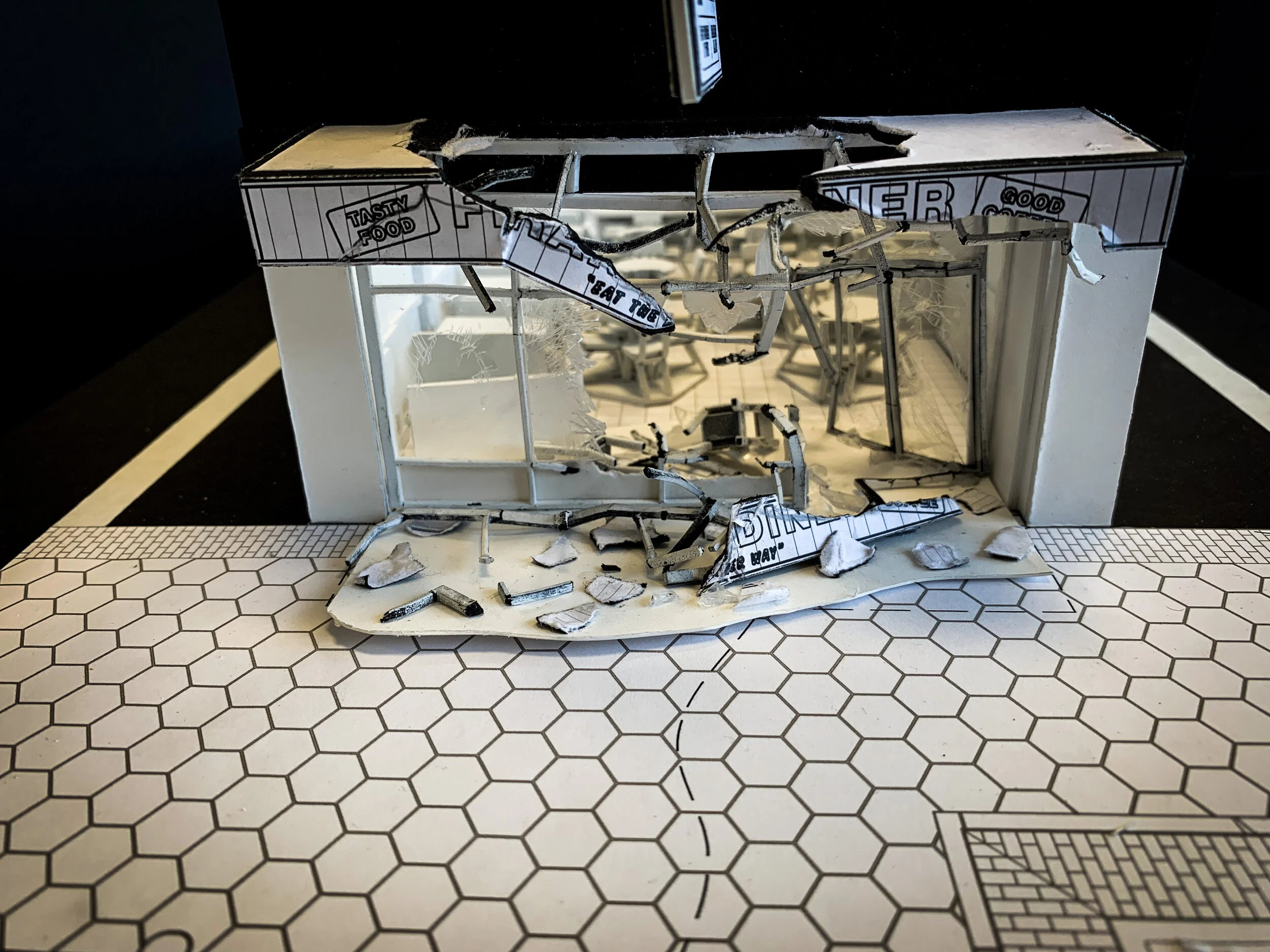 3/4” scale model of the front of Frank’s Diner after damage. The construction department requested a larger model of this specific set in order to better understand how to fabricate the damaged set.