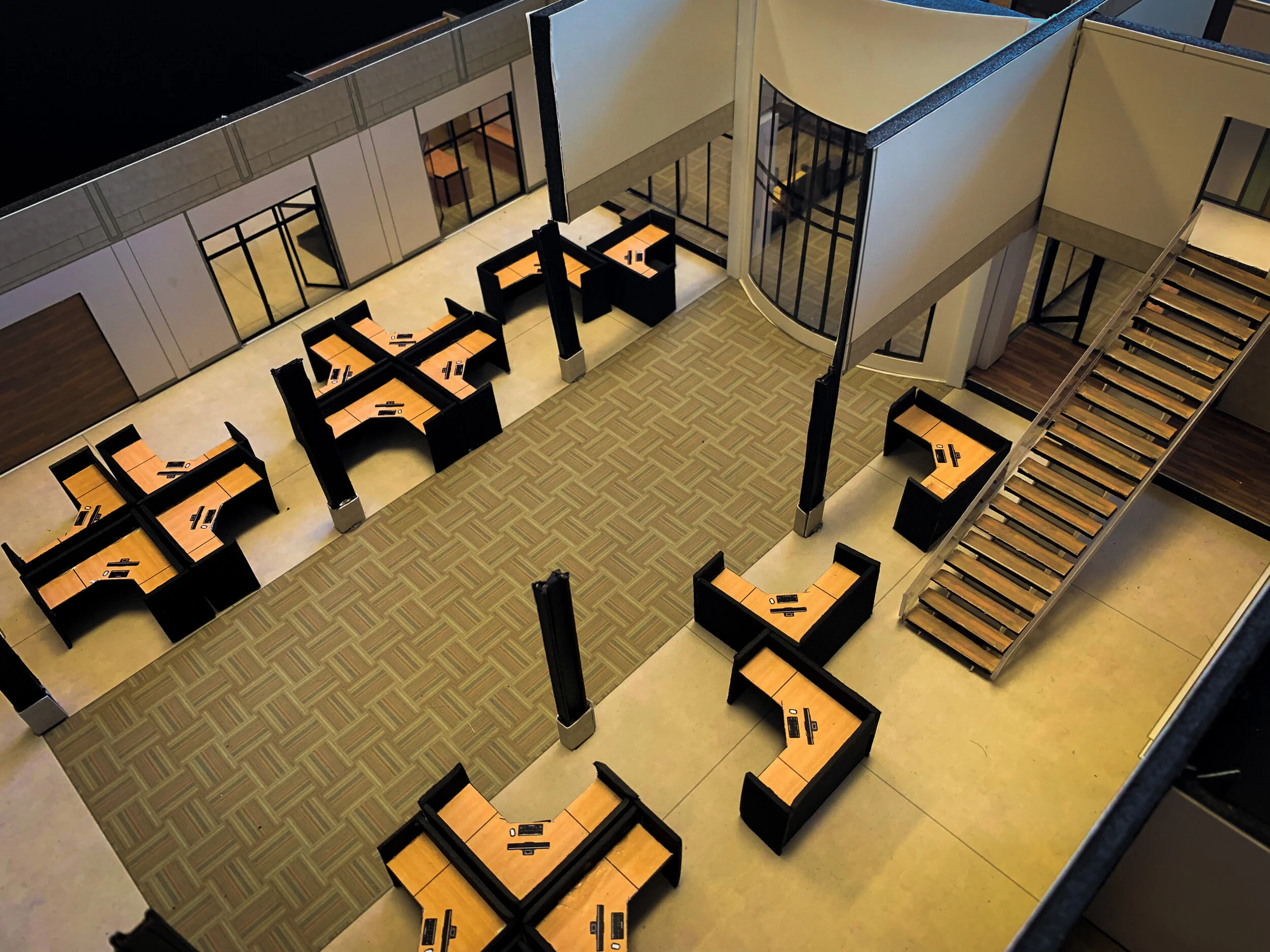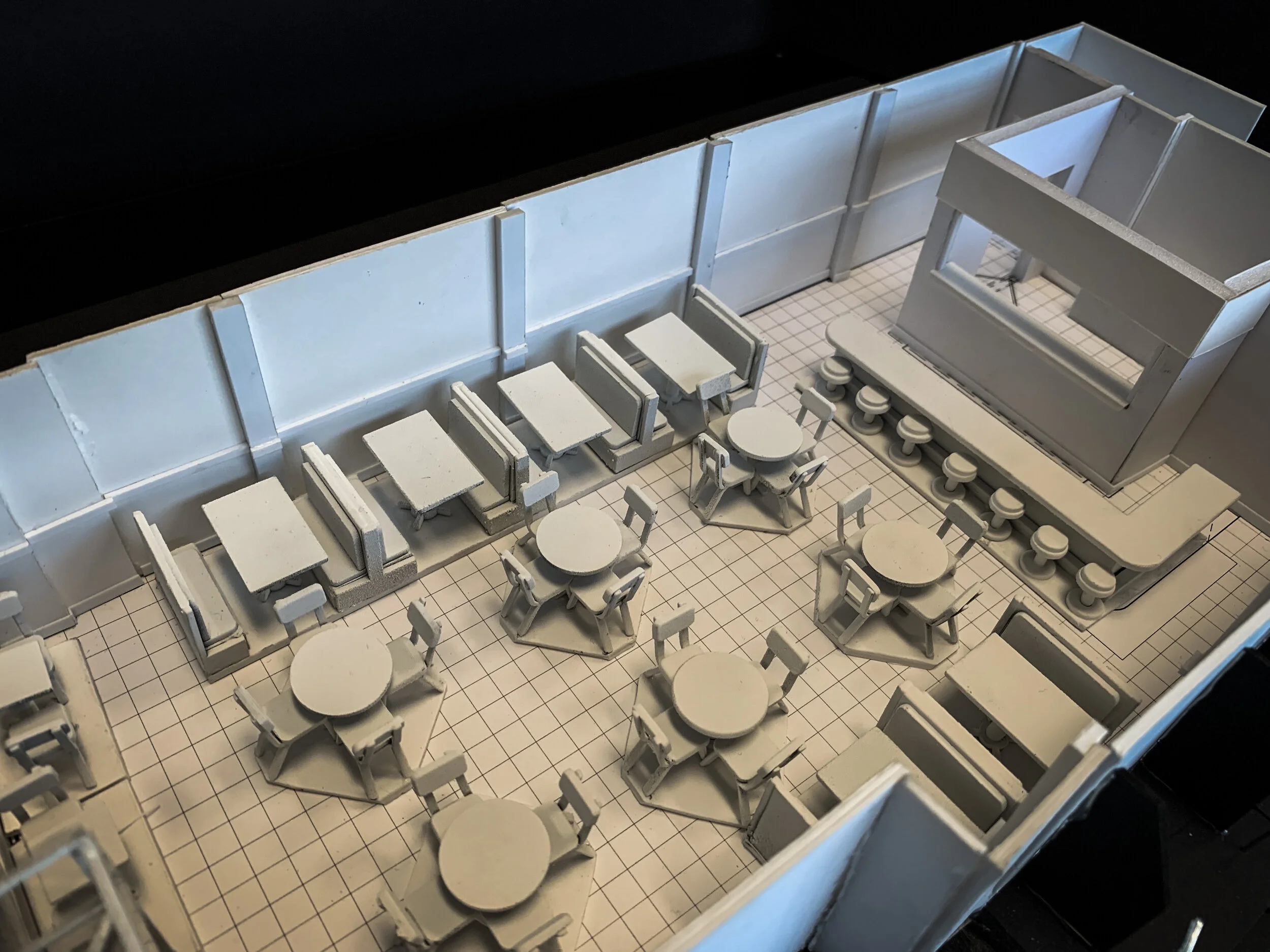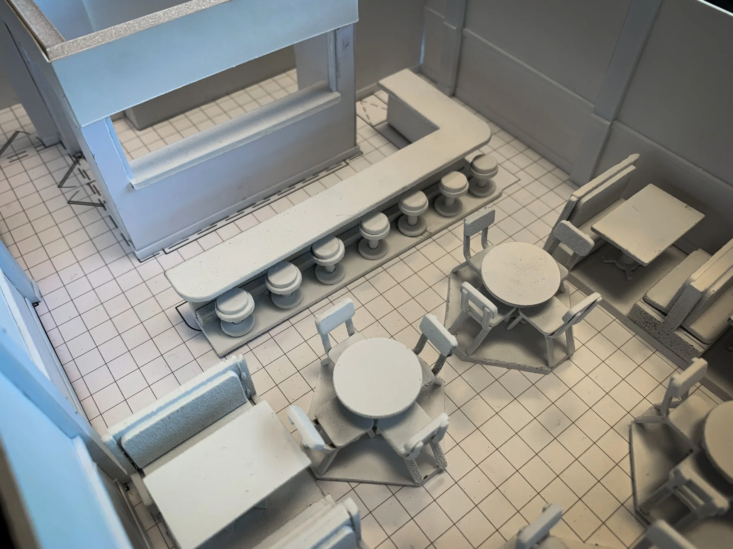 1/4” scale model of Franks Diner, made from foam core, chipboard, and acetate. The store front is removable to be swapped for a damaged store front.