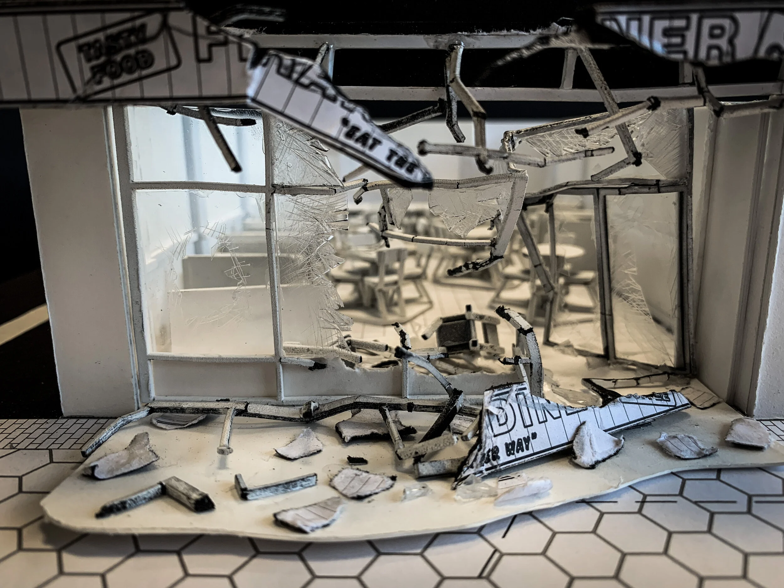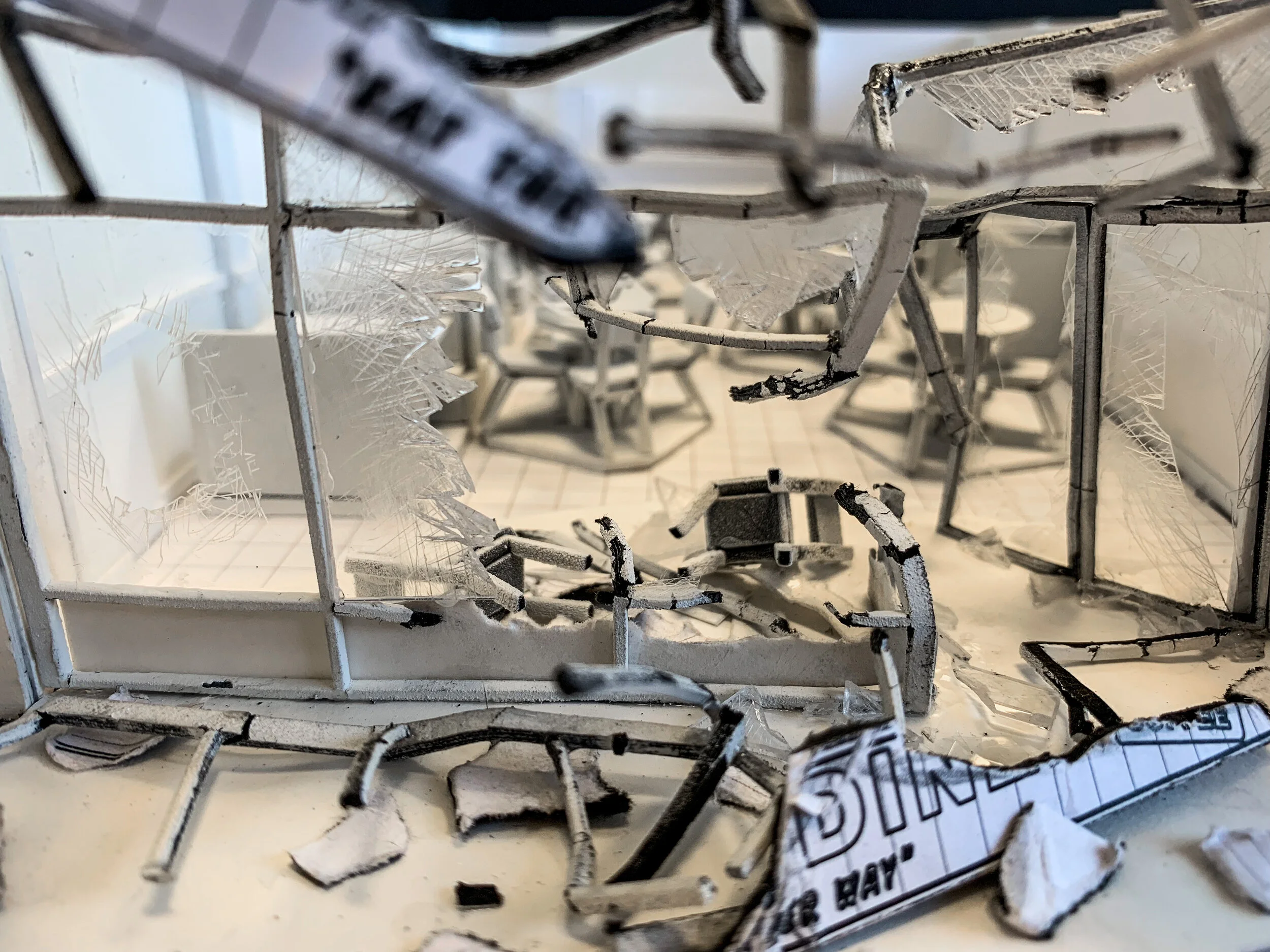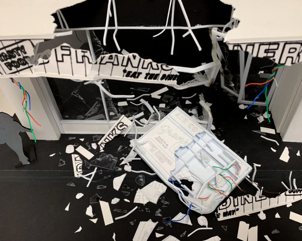 1/4” scale model of Franks Diner, made from foam core, chipboard, and acetate. The store front is removable to be swapped for an undamaged store front.